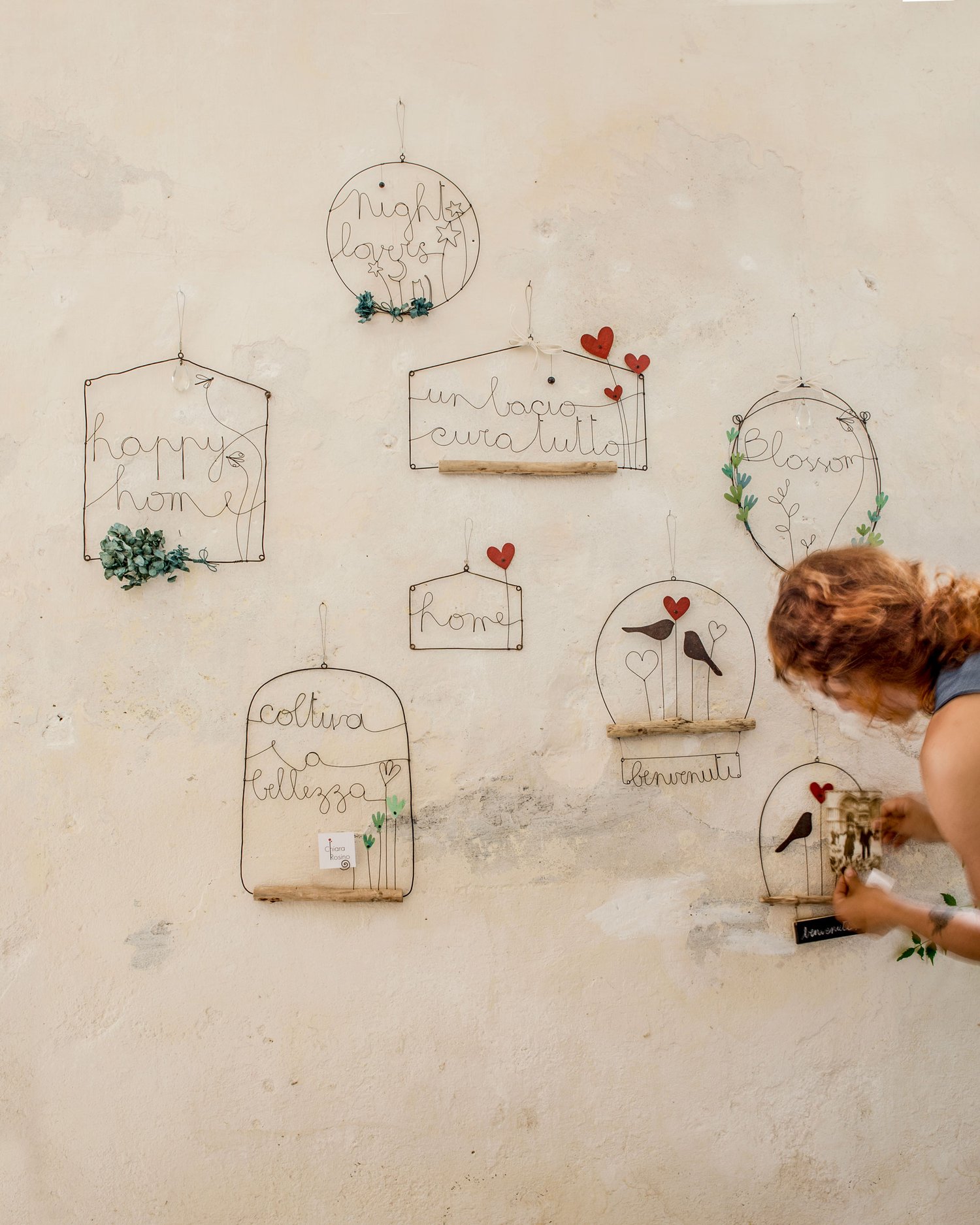 Filo di ferro cotto, rametto, lamierino e filo di ottone sagomato e antichizzato, cuore in carta pesta, legno dipinto con vernice lavagna, perla vetro trasparente, sottile filo di ferro per appenderlo.