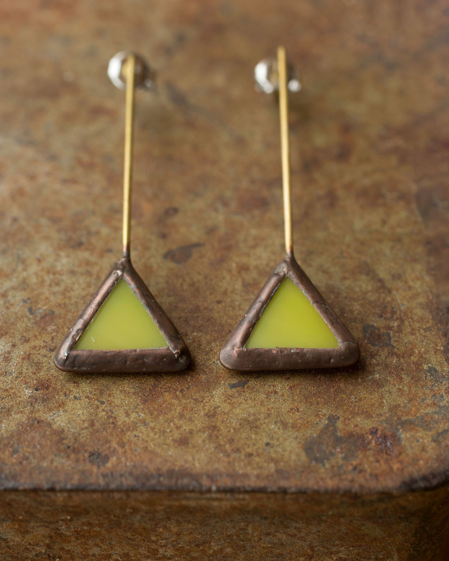 orecchini in vetro e ottone, montatura in tecnica tiffany antichizzata, forna rettangolo, fermi in acciaio anallergico.